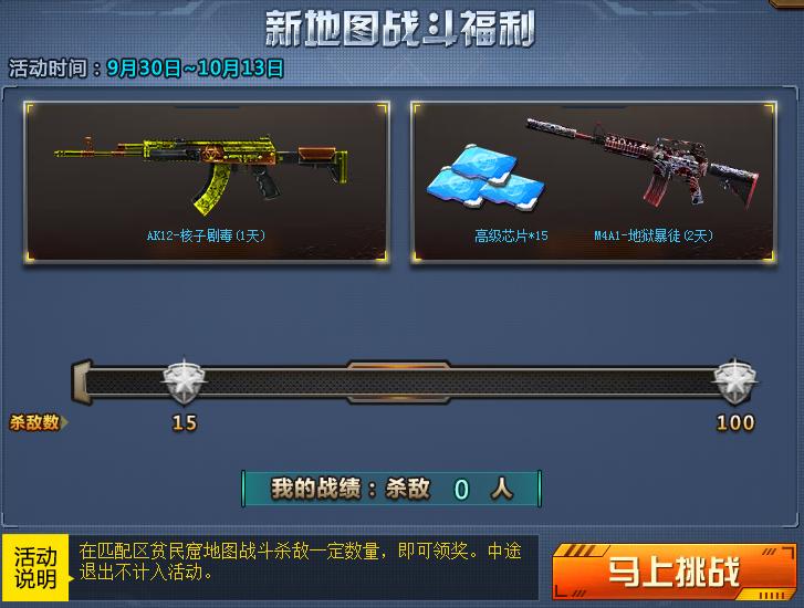 在匹配区贫民窟地图战斗杀敌达到一定数量,即可领奖,中途退出不计入活动。