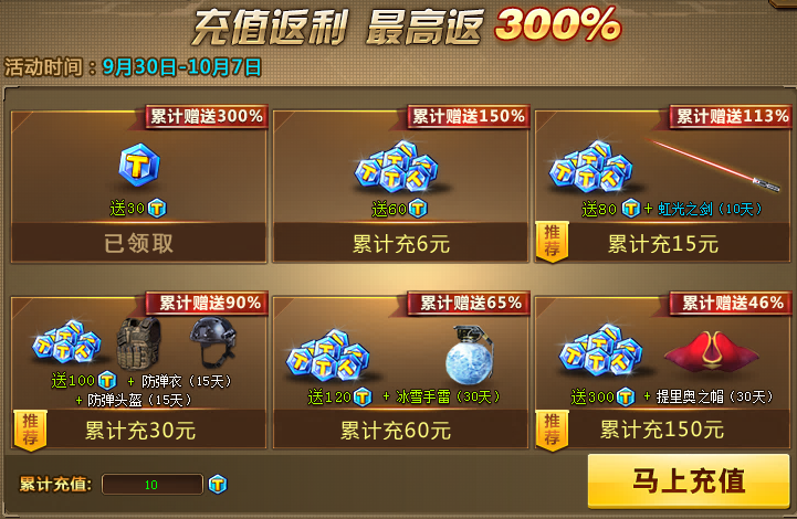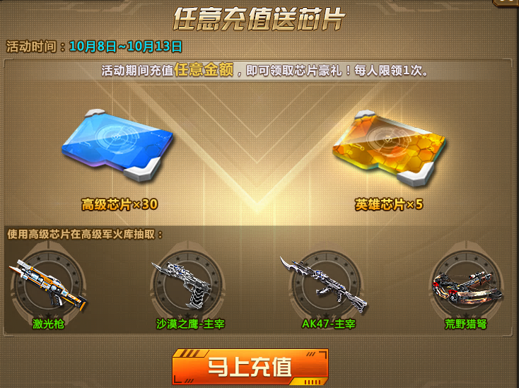 活动规则:充值任意金额,即可领取30个高级芯片和5个英雄芯片,快去军火库试试运气吧!