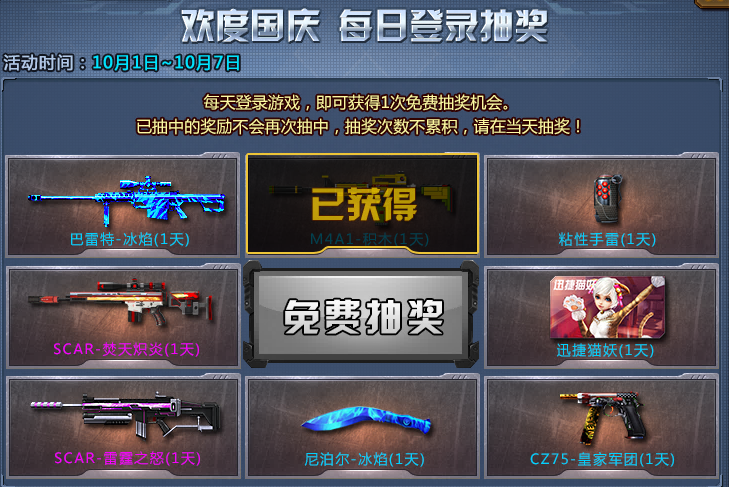 ① 活动期间每天登录游戏即可获得1次免费抽奖机会;抽奖次数不累积,请在当天抽奖!