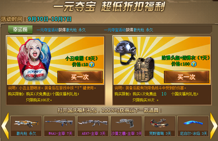 ① 1元购买1次小丑喷图,免费送1个国庆福利礼包;10元购买1次防具套装,免费送10个国庆福利礼包。超低折扣福利,你不容错过!