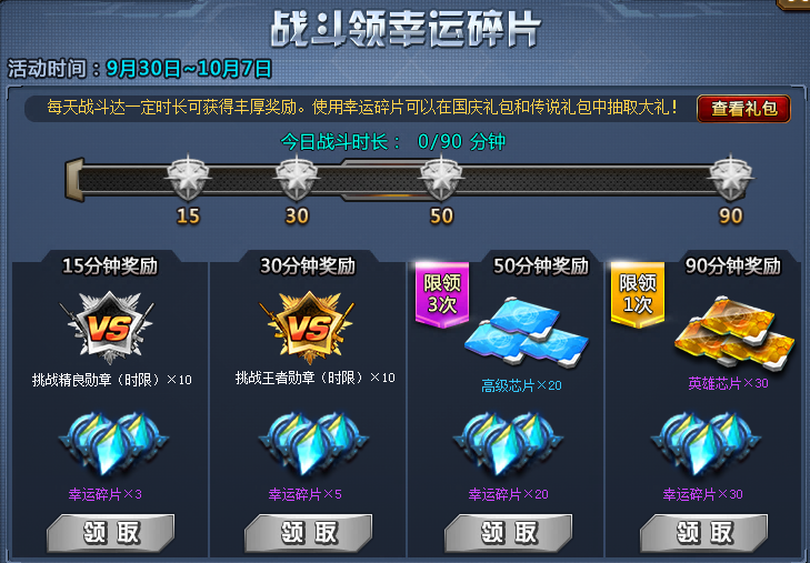① 玩家每天战斗达到一定时长可以获得幸运碎片等奖励。使用幸运碎片可以在国庆礼包中抽取豪华大礼!