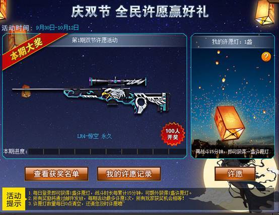 双节专属福利!每日登录、战斗可获得许愿灯,每盏许愿灯可参与许愿,赢取永久武器、幸运钥匙礼包、海量幸运碎片等你来!免费抽礼包不再是梦!
