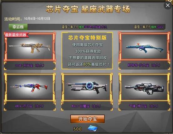 5把最新星座武器,统统永久!500高级芯片即可抽取1次,回收道具还可返还400高级芯片!