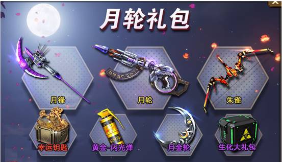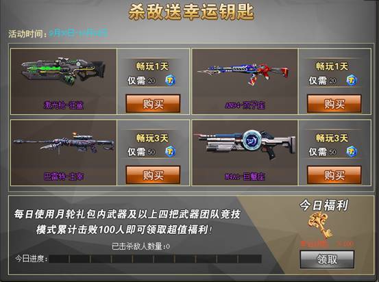 活动期间使用月轮礼包内任意武器以及四把特惠武器进行杀敌达到指定数量,即可领取海量幸运钥匙!