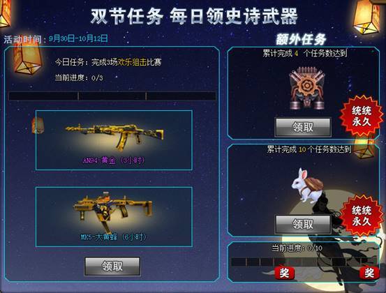 双节专属福利!每日完成指定模式,天天领史诗武器。累计完成任务达到指定数量,还可领取额外奖励,永久玉兔、永久喷气背包等你来领!