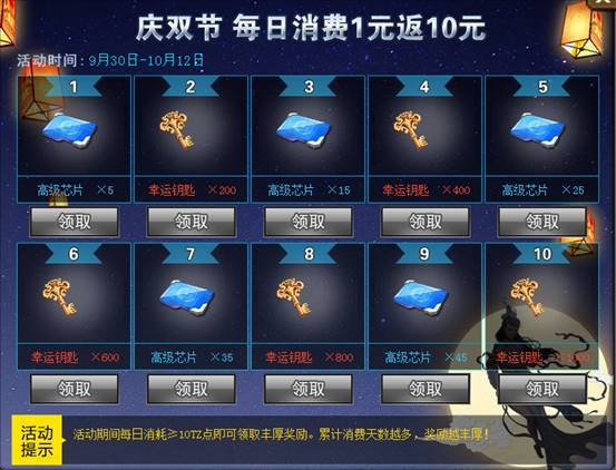 庆无双礼包上线,消费返利来啦!每日消费≥10TZ点,即可领取丰厚奖励!最高1000幸运钥匙等你来领!