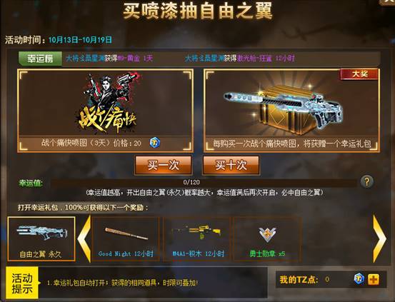 购买战个痛快喷漆即可获得自由之翼礼包!有机会直接获得永久自由之翼,远远低于商城售价。机不可失,失不再来!