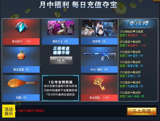 7日夺宝特别版,每日充值任意额度即可参与夺宝,已抽中的道具不会重复获得!7日100%拿满所有奖励!