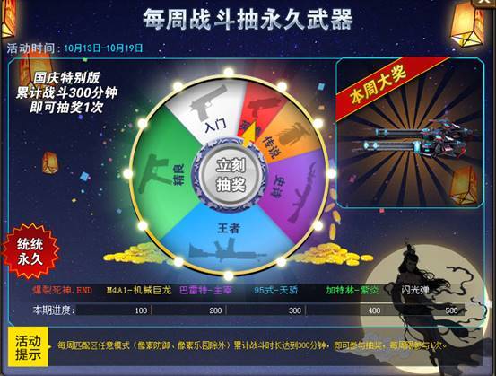 每周战斗达到指定时长即可参与抽奖,通通永久武器!
