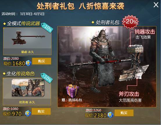 活动期间玩家最低可以8折价格购买处刑者及暴虐,更可获赠价值10元的挑战礼包!
