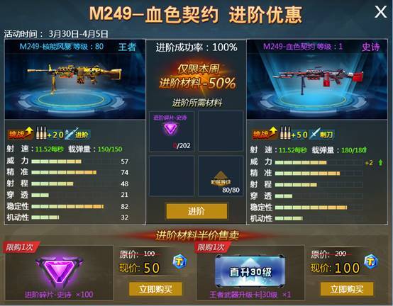 M249-核能风暴进阶为M249-血色契约半价优惠,更有进阶碎片、武器直升卡抄底价售卖!