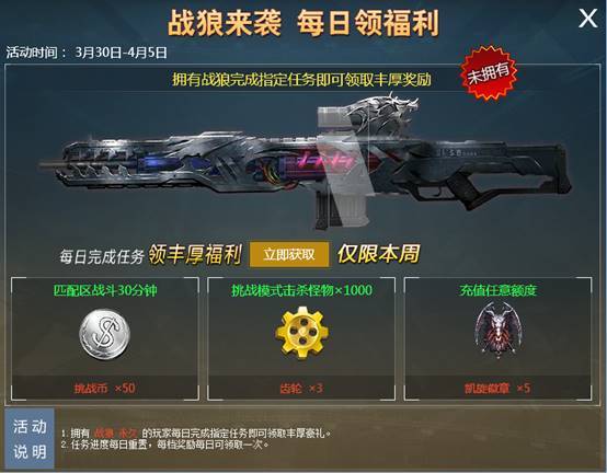 活动期间战狼9折售卖,拥有战狼永久的玩家完成任务后更可获得海量强化材料!