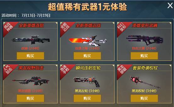 稀有一元武器体验继续开放,本周进行调整!!!只需3元,你便可以享受到黑龙套装!!!更有热门武器战狼!!!放逐之锋!!!英雄级自由之翼!!!等你来体验!!
