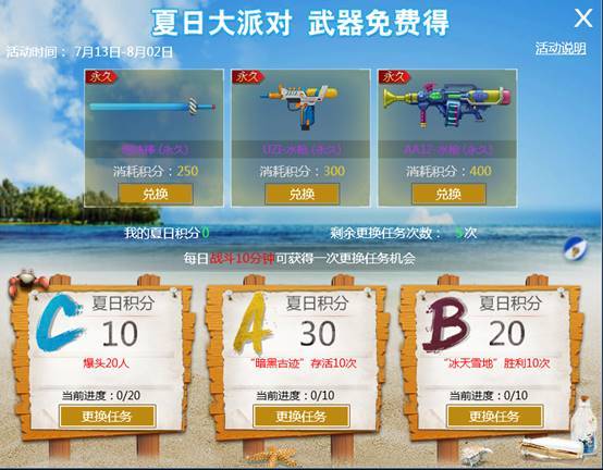 夏日派对永不停!!!上两周没拿到我们的泡沫棒、UZI-水枪的同学不要伤心,不要失望!本周还有的拿,而且已经拿过的同学也不要觉得会重复的,本周更换领奖形式为积分兑换!只要积分够,三款武器任你挑!