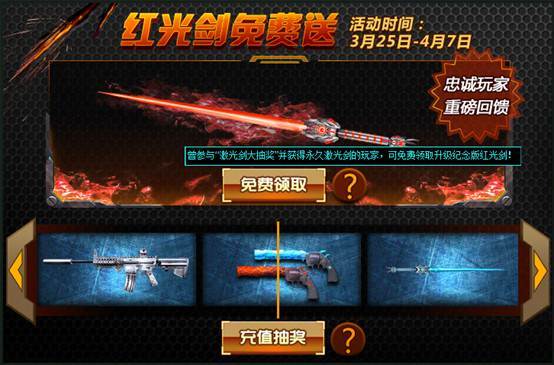 (2)没有免费领取资格的玩家,充值任意金额也可以进行抽奖活动哦,7天、3天超值武器任你抽,100%中奖,手气够好也能获得激光剑!