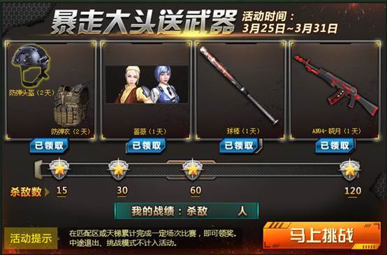 【活动规则】在匹配区新模式暴走大头中累计杀敌一定数量,即可领奖!
