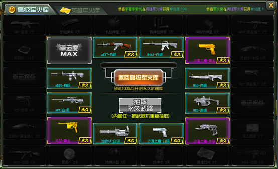 (1)军火库重新改版,高级军火库新增产出黄金武器,使用金币即可抽取;英雄军火库使用TZ点抽取;