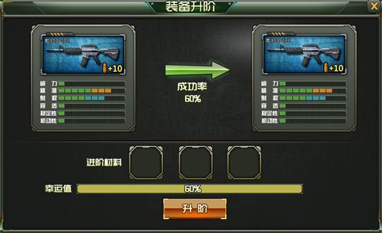 (1)玩家通过战斗获得武器经验(武器等级可在仓库展示栏中查看),经验满级后可在仓库中使用“升阶”功能,有机会为武器晋升高一级的品质,提升属性。