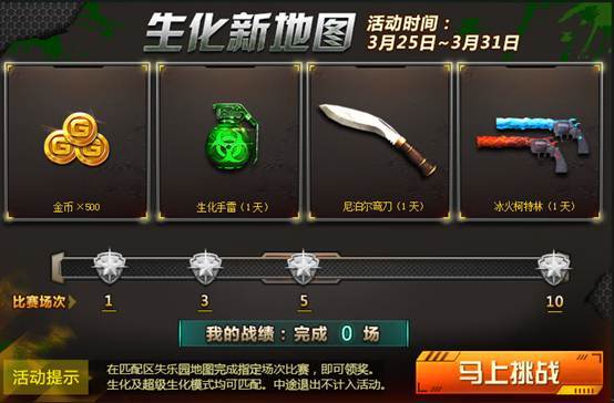 【活动规则】在匹配区新地图失乐园累计完成指定场次,即可领奖!生化模式和超级生化模式都可匹配哦。