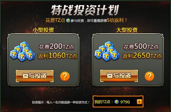 【活动规则】花费200TZ点,购买后的30天内可返利1060TZ点;花费500TZ点,可返利2650TZ点!最高返利5倍,每人只限参与1次,赶紧选择你的专属投资计划吧。