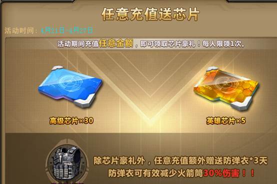 活动期间内,充值任意金额,即可领取芯片豪礼,现在还额外赠送防弹衣*3天。