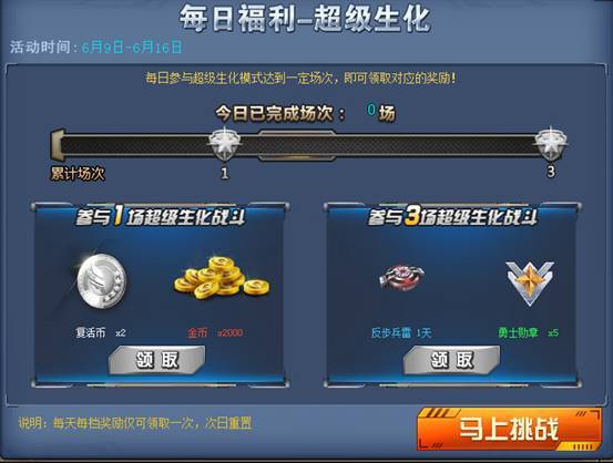 每天完成匹配区超级生化模式1场和3场,即可领取稀有激光枪~