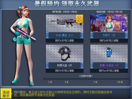 每天战斗15分钟,预约永久武器!你没看错!真的永久,真的雷击,只要10天即可完成预约。每天上线就仿佛看到我的SCAR-雷击在向我招手!