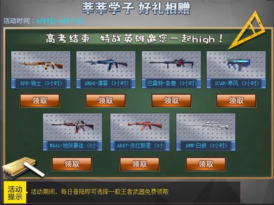 这满满一黑板的王者武器,是不是有点战争之王既视感!没错,要的就是这种帝王选妃的感觉,每天挑一把武器临幸,就在特战英雄!