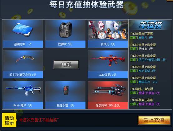 活动期间充值任意金额,即可参与1次抽奖,每日限参与1次。