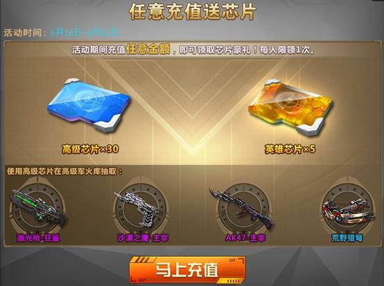 活动期间充值任意金额,即可领取高级芯片*30、英雄芯片*5。每日限参与1次。