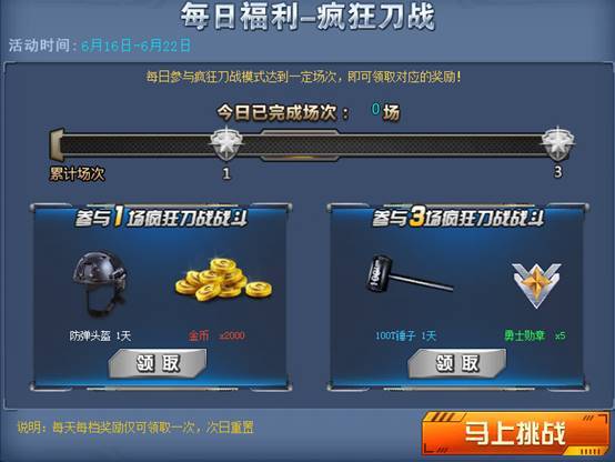 每天完成匹配区超级生化模式1场和3场,即可领取稀有激光枪~