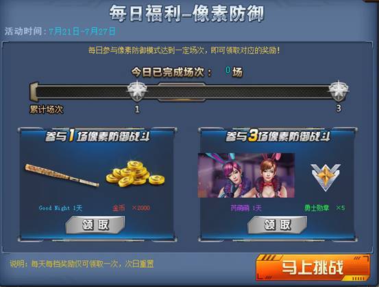 每天参与像素防御模式1场和3场,即可领取超值奖励~