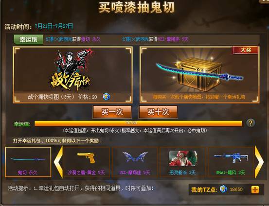 超值活动!买喷漆抽鬼切,最帅的喷漆配最帅的近战武器!更有沙漠之鹰-黄金、UZI-摩羯座等稀有武器!