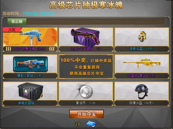 芯片夺宝再次来袭,本期主题“最新史诗级副武器——TEC9极寒冰魄”。消耗高级芯片即可参与夺宝,更有稀有武器箱等你来拿!