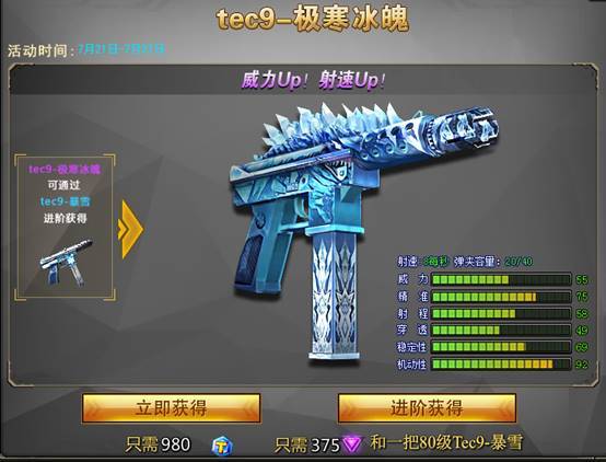 TEC9-极寒冰魄闪亮登场,直接购买只需980TZ点,进阶获得需375史诗进阶碎片和一把80级TEC9-暴雪!