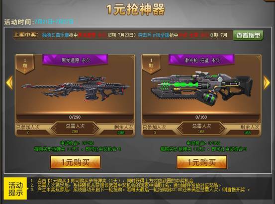 活动期间玩家1元即可参与史诗级神器夺宝活动,一块钱买一份希望,万一你就是那个幸运儿呢?
