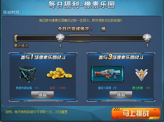 每天参与像素乐园模式1场和3场,即可领取超值奖励~
