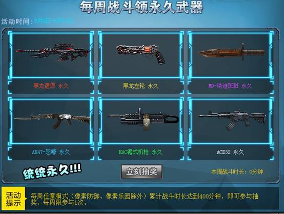 暑假福利再升级!每周累计战斗时长达到400分钟即可参与抽奖,6把永久武器等你来抽。更有机会免费获得英雄级狙击枪——黑龙遗愿!