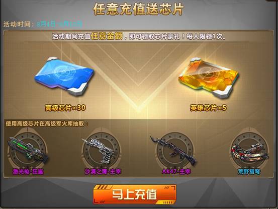 活动期间任意充值即可领取高级芯片*30、英雄芯片*5,超丰厚奖励免费领取!
