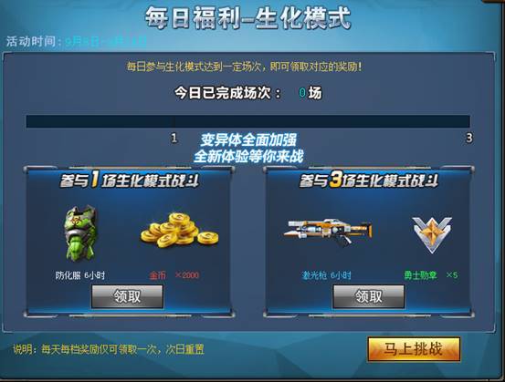 每天参与生化模式1场和3场,即可领取超值奖励~