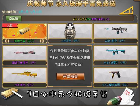 每日登陆即可免费抽奖1次,获得的奖励不会重复获得!登录7天必得永久板擦手雷啦!