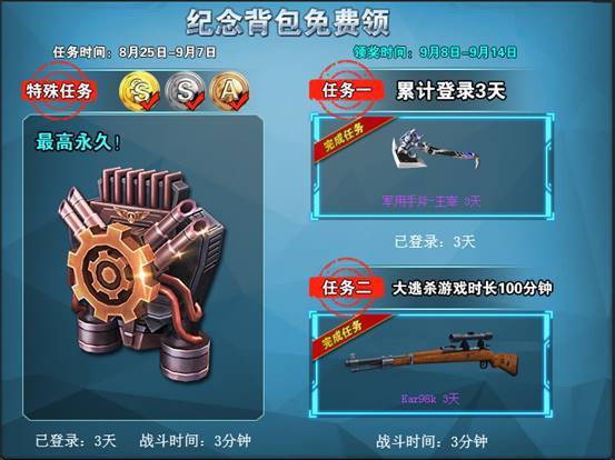 绝地求生背包终于到了领奖阶段啦!任务时间已达到目标的任务均可在本周更新后领取对应奖励。那么问题来了,你的喷气背包是不是永久呢?