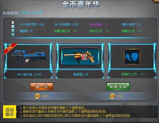 开学了,海量王者武器金币即可抽奖!P90-审判者、反步兵雷、巴雷特-屠夫、CZ75-皇家军团等你来抽!