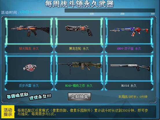 暑假福利再升级!每周累计战斗时长达到300分钟即可参与抽奖,6把永久武器等你来抽。更有机会免费获得英雄级霰弹枪——狱火烛龙!