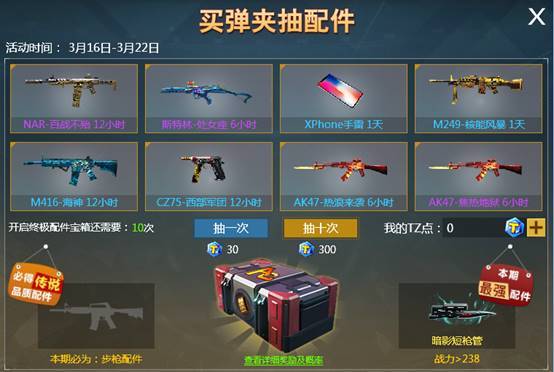 活动期间玩家购买弹夹即可参与抽奖,必中豪华军备!累计抽奖十次更可开启一次终极配件宝箱!本期配件宝箱必定为传说级步枪配件!