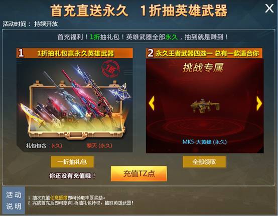 完成首充的玩家可享受1折抽礼包的丰厚福利!同时可在MK5-大黄蜂、M4A1-幽冥狼、AK47-怒嚎、LR4-惊空中进行四选一获得永久武器!