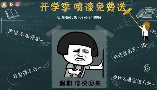玩家只要在2018.09.07-2018.09.09期间的任意一天登录游戏,就可以免费获得永久开学喷漆。