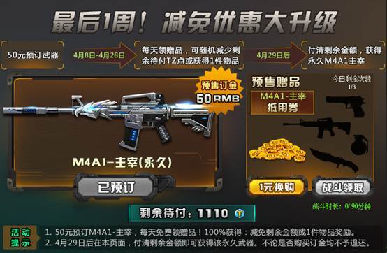 (1)50元预订主宰武器后,每天可以免费领取赠品!100%获得1件物品奖励或减慢剩余金额,每次最高可减免50TZ点哦。