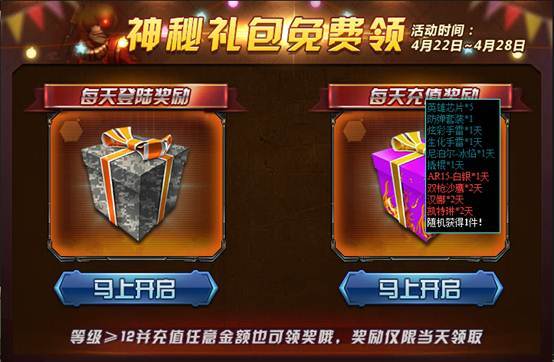 【活动规则】每天登陆可领取奖励,等级≥12级并充值任意金额也可领奖哦!奖励仅限当日领取。