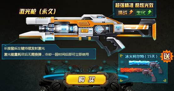 【活动规则】永久激光枪限时优惠抢购!花费1380TZ点购买,即送限量双持手枪冰火柯尔特(15天),也可以在商城购买不同价格的时限哦。